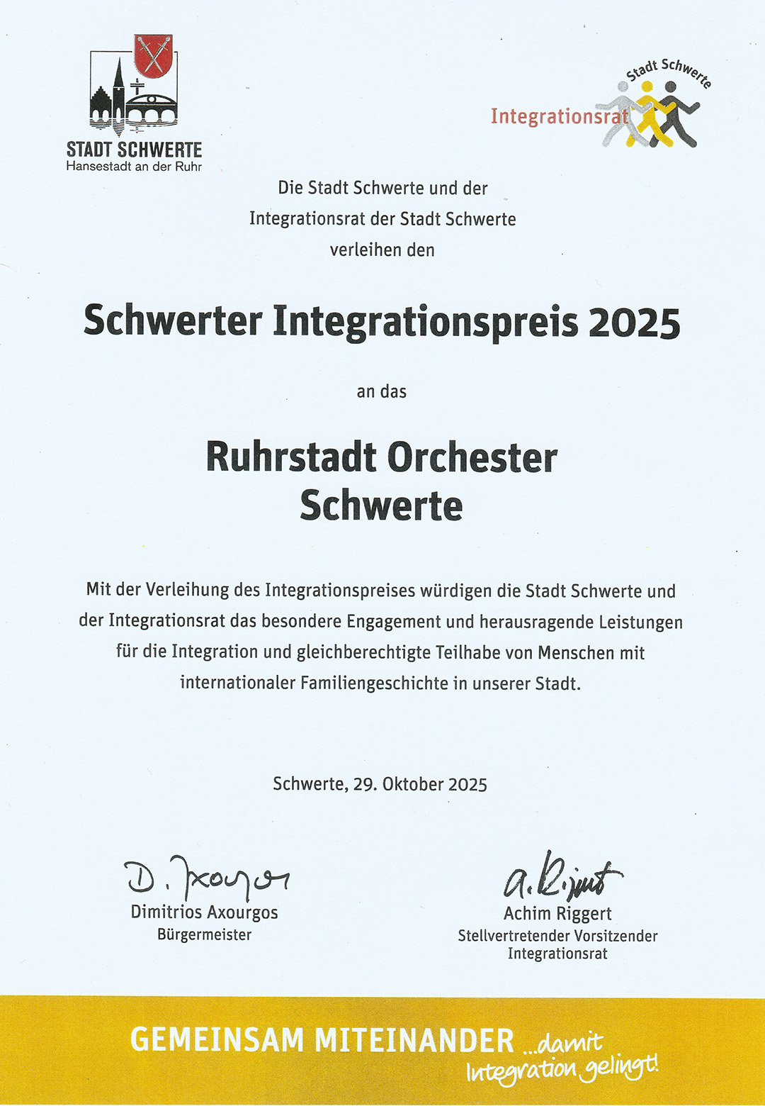 Die Stadt Schwerte und der Integrationsrat haben dem Ruhrstadt Orchester Schwerte am 29. Oktober 2025 den Integrationspreis verliehen. Ausgezeichnet wurde das besondere Engagement des Orchesters für gelebte Vielfalt und gleichberechtigte Teilhabe von Menschen mit internationaler Familiengeschichte.